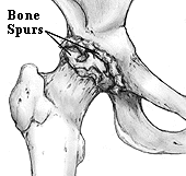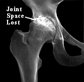 OSTEOARTHRITIS AND RHEUMATOID ARTHRITISOsteoarthritis mainly damages the joint cartilage, but there is often some inflammation as well. It usually affects only one or two major joints (usually in the legs). It does not affect the internal organs. The cause of hip osteoarthritis is not known. It is thought to be simply a process of wear and tear in most cases. Some conditions may predispose the hip to osteoarthritis, for example, a previous fracture that involved the joint. Growth abnormalities of the hip (such as a shallow socket) may lead to premature arthritis. Some childhood hip problems later cause hip arthritis (for example, a type of childhood hip fracture known as a Slipped Epiphysis; also Legg-Pertheís Disease). In osteoarthritis of the hip the cartilage cushion is either thinner than normal (leaving bare spots on the bone), or completely absent. Bare bone on the head of the femur grinding against the bone of the pelvic socket causes mechanical pain. Fragments of cartilage floating in the joint may cause inflammation in the joint lining, and this is a second source of pain. X-rays show the ìjoint spaceî to be narrowed and irregular in outline. There is no blood test for osteoarthritis.