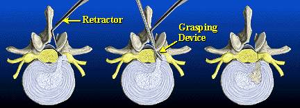 To alleviate the pain of a ruptured or herniated intervetebral disc (see Spinal Anatomy), a Laminotomy/Microdiscetomy may be performed. This surgical procedure is carried out in two steps beginning with the laminotomy. Lamina is the Latin name given to the bone protecting the spinal canal, and otomy means opening or hole. The laminotomy simply opens up the spinal canal in order to visualize the pinched nerve root.